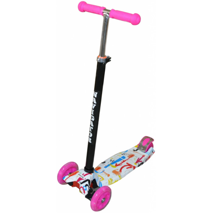 Самокат подходит для детей от 3 до 8 лет. Платформа и рама выполнены из нейлона и пластика. Регулируемый руль изготовлен из легкого алюминиевого сплава, имеет три уровня фиксации (до 62 см).