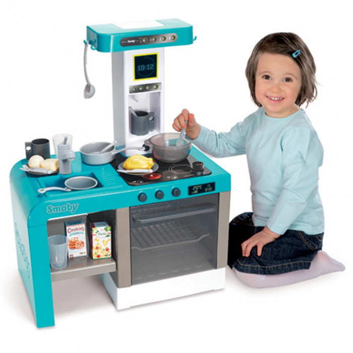 Компания Smoby изготовила компактную и многофункциональную кухню. Она оборудована плитой с функцией кипения воды и звуками приготовления пищи. Лишь поставь на одну часть плиты сковороду и сразу услышишь звук шипения и шкварчания. А поставив рядом на плиту кастрюльку с водой, наблюдай, как пузырьки поднимаются на поверхность.