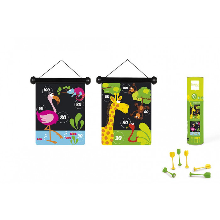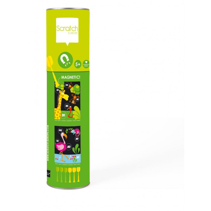 Замечательная игра уникальна по своей концепции и дизайну. Магнитный холст можно повесить двумя разными способами. Дротики сделаны из пластика с металлическим наконечником. Не острые! Поэтому игра полностью безопасна для детей. Холст и 6 дротиков хорошо упакованы в тубус из прочного картона.