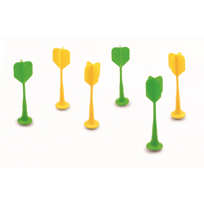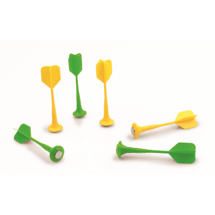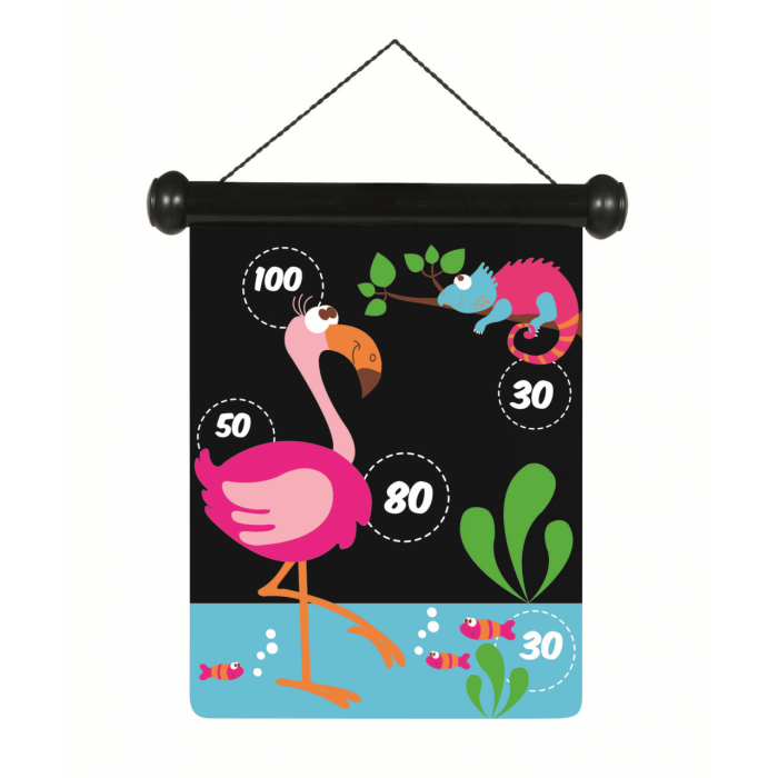 Наконец игра в дартс стала доступна для самых юных непосед. Острые концы дротиков заменены круглыми магнитиками, а скучная мишень с числами — веселыми персонажами!
