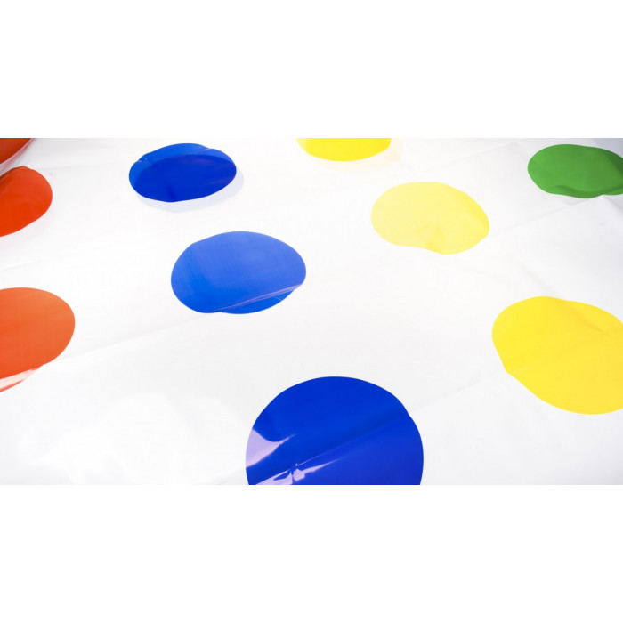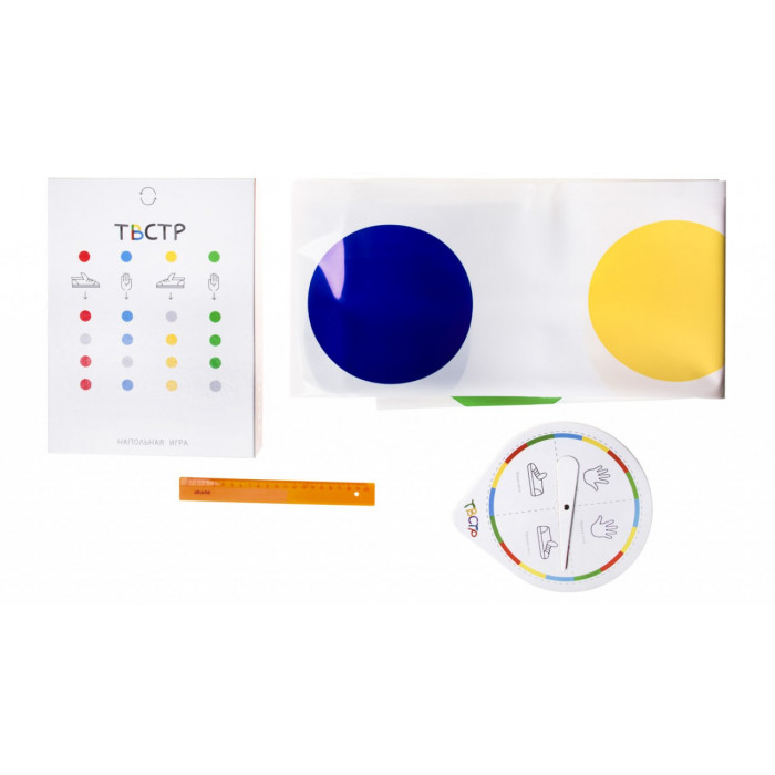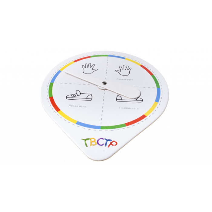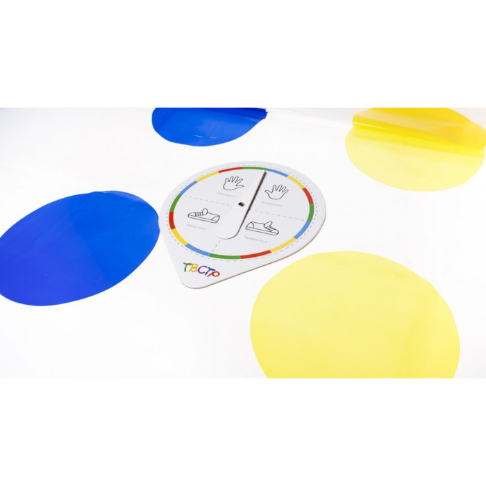 Разложите коврик. Один из игроков становится судьей и берет рулетку. Он будет раскручивать стрелку и объявлять выпавший результат. Например: правая рука на зеленый. Игроки по очереди выполняют задания, перемещая свои руки и ноги на круги заданного цвета.