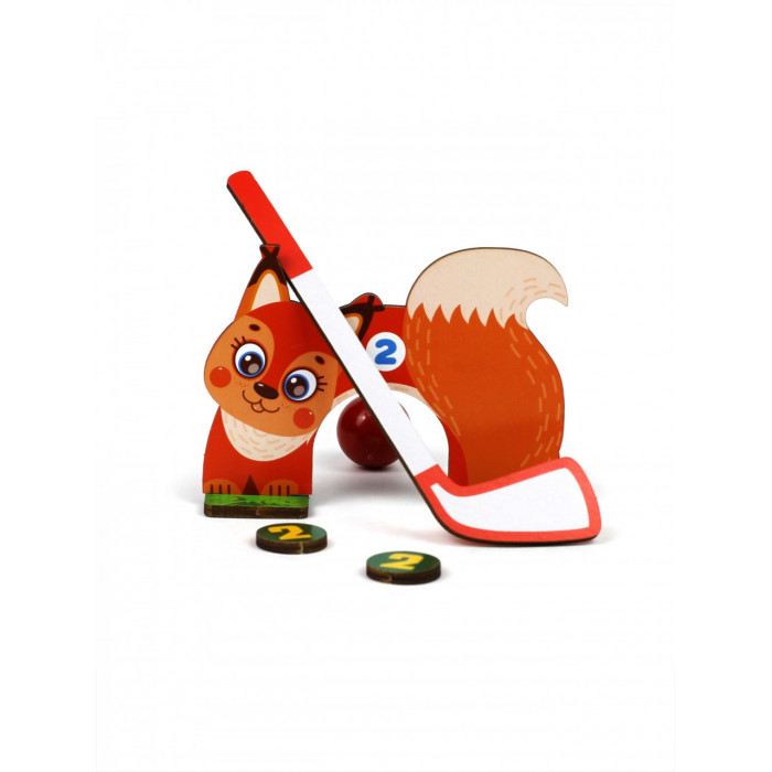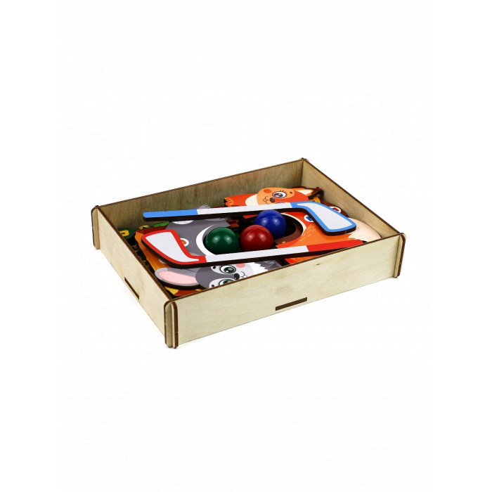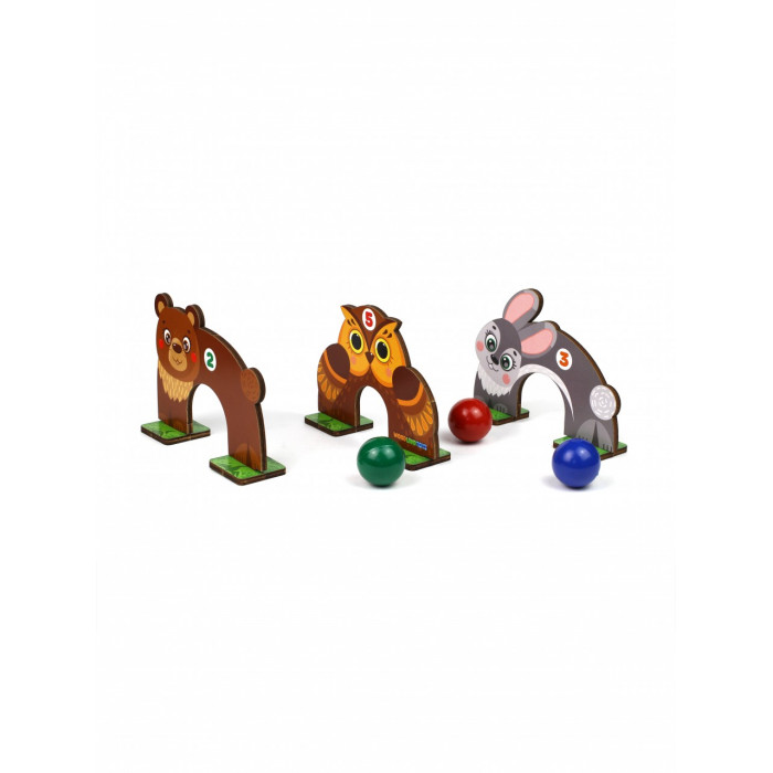 Игрушка представляет собой комплект из 8 красочных арок с отверстиями разного размера, 3 цветных шариков, 2 клюшек и набора бонусных фишек-медалей.