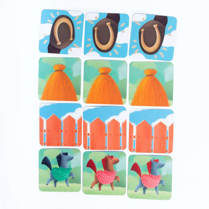 Как играть? Игровой ход участника состоит из двух типов действий: препятствующих победе или способствующих ей. Препятствуем — приходится строить загон, выкладывая все имеющиеся на руках карты с забором. Способствуем — размещаем 3 пони с общим свойством в загон или разбиваем подковой 2 карточки забора, или кладем в загон 1 сено. При этом игроки могут делиться картами, чтобы помочь другу собрать нужную тройку пони. Также можно вести совместное обсуждение и планировать ходы, оценивая целесообразность тех или иных действий. Игроки не соревнуются, а двигаются к победе вместе. Для победы важно успеть наполнить загон сеном и чудо лошадками раньше, чем замкнется забор. Иначе игра будет проиграна.