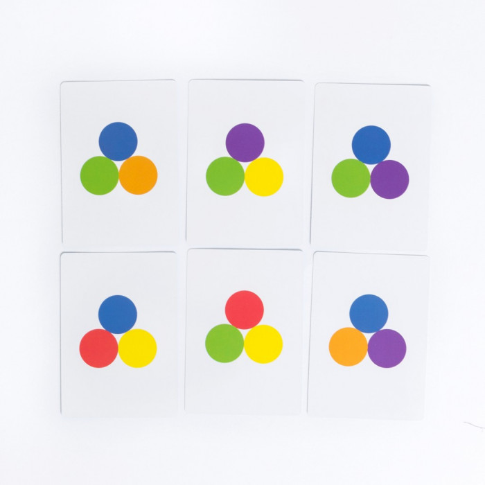 Перед вами — нарядные матрешки в разноцветных платьях и платочках. Среди них нет двух одинаковых! И жесты у них у всех разные: кто руками всплеснул, кто — за голову схватился. У ведущего — целая колода карточек с разными цветовыми комбинациями.