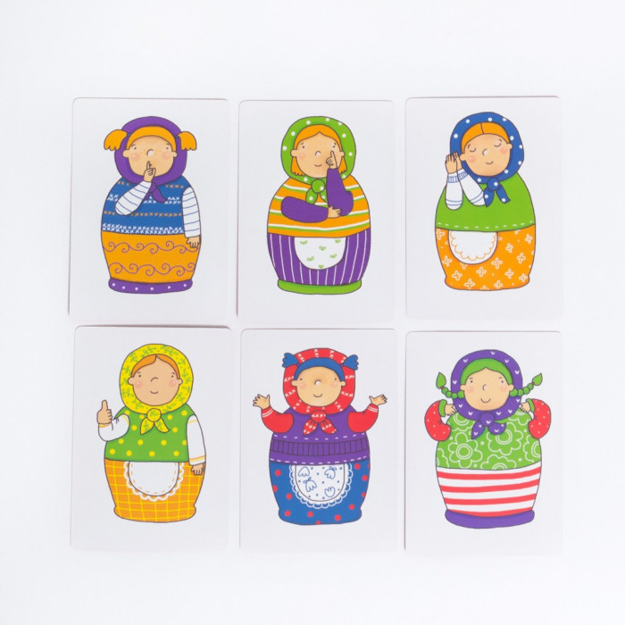 Каждой карточке соответствует одежда только одной матрешки. Ведущий по очереди открывает карточки из своей колоды. Игроки наперегонки ищут нужную матрешку, чтобы повторить ее жест. Кто успел первым — получает от ведущего разыгранную карточку. А ведущий — предъявляет всем следующую.