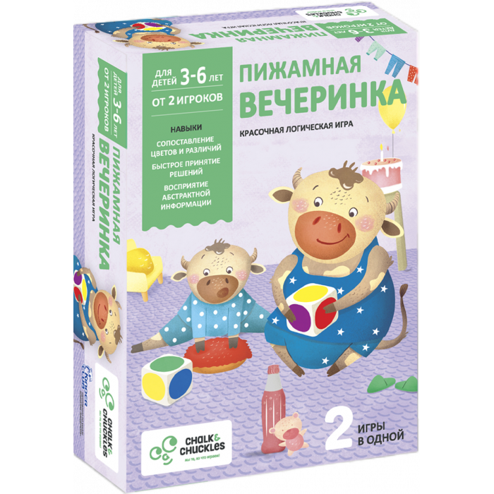 Малыш Му организовал пижамную вечеринку. Необходимо сопоставить цвета и первым найти приглашенного теленка, цвета одежды которого соответствует цветам на кубиках. Выигрывает тот, у кого будет больше друзей на вечеринке.