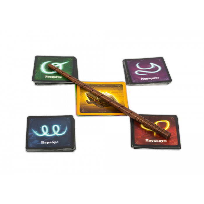 Угадывают заклинание все одновременно: для этого надо громко произнести его название и указать на правильную карточку. И волшебник, и угадавший получат по карточке в свою книгу заклинаний, а также поменяются местами. Теперь в игре новый волшебник! Однако, он попадет под действие угаданного им заклинания. Что это значит? Например, он превратится в единорога или лягушку и будет показывать следующее заклинание, приставив палочку ко лбу или присев на корточки. Это очень весело!