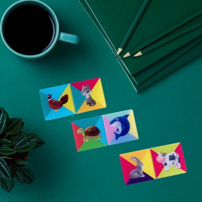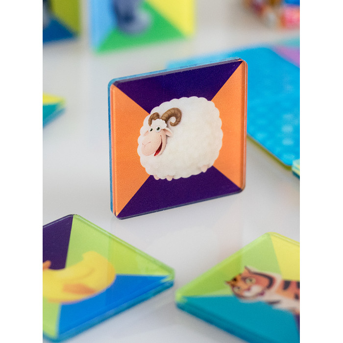 Это отличный тренажер для памяти. Раскладываем фишки-квадратики сначала зверушками наверх, запоминаем расположение парных, переворачиваем рубашкой наверх. Побеждает тот, кто за быстрее открыл большее число парных зверушек. Идеальный вариант настольной игры для детей, которые любят задачки на внимательность.