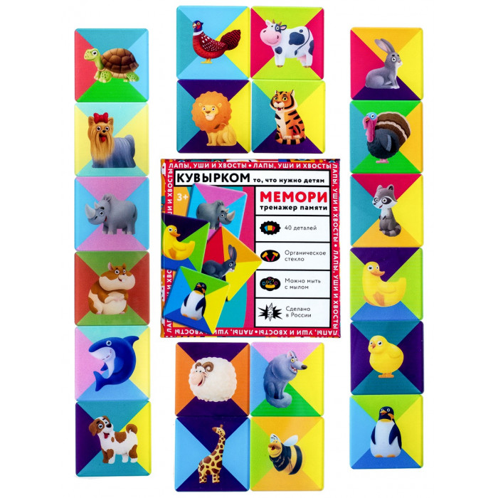 Игра "Мемори" из серии "Лапы, уши и хвосты" состоит из 40 квадратиков (20 парных картинок на разноцветном фоне).