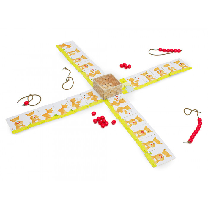 Собирай земляничку вместе с медвежатами и учись считать! Медвежата гуляют по лесным тропинкам и собирают землянику. Раз земляничка, два, три... Хочешь к ним присоединиться? Собранные ягодки надо пересчитать и достать столько же больших деревянных бусин из лукошка, а потом нанизать их на свой шнурочек.