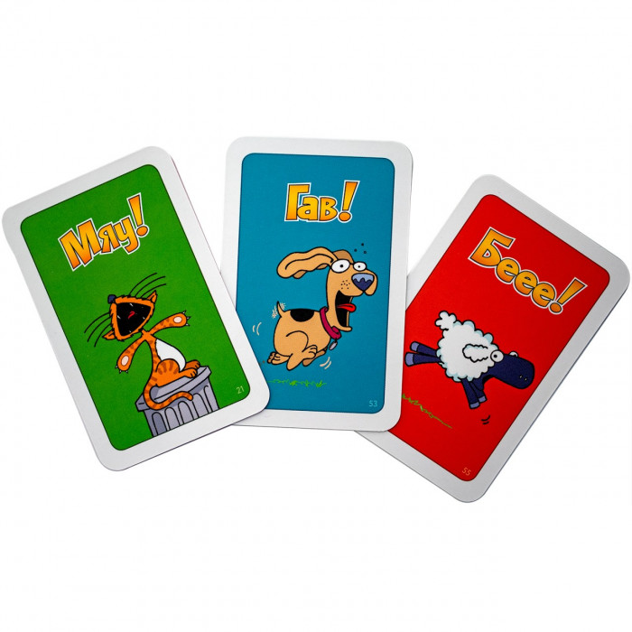 Примеры игры: нашел собаку, как у игрока напротив? Гавкайте оба: кто успеет первым, тот отдаст свою карточку! У тебе есть овца, и у другого игрока тоже? Скорее кричи "Бееее!" Видишь корову у соседа? Кричи, как корова "Мууууу!"