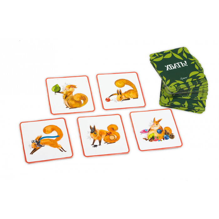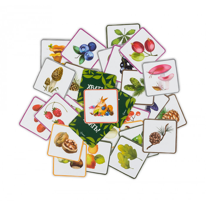 "Хвать!" - быстрая логическая игра для детей и их родителей. В этой настольной игре вы найдете карточки с грибами, листьями, орехами, шишками, ягодами. Победит тот игрок, который первым соберет 5 карточек с припасами одного вида. Для этого участники каждый ход обмениваются карточками, надеясь отдать лишние припасы и получить недостающие.