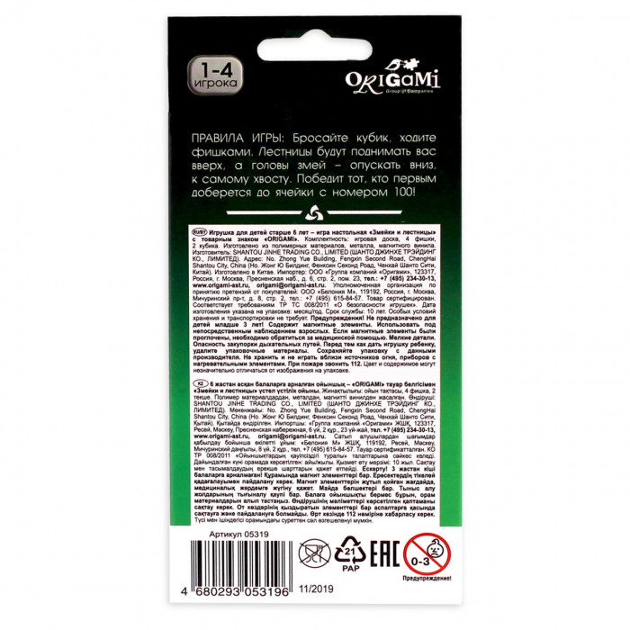Настольная игра ORIGAMI Змейки и лестницы (магнитная) 5319