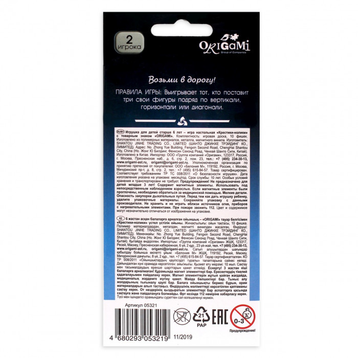 Настольная игра ORIGAMI Крестики-нолики (магнитная) 5321
