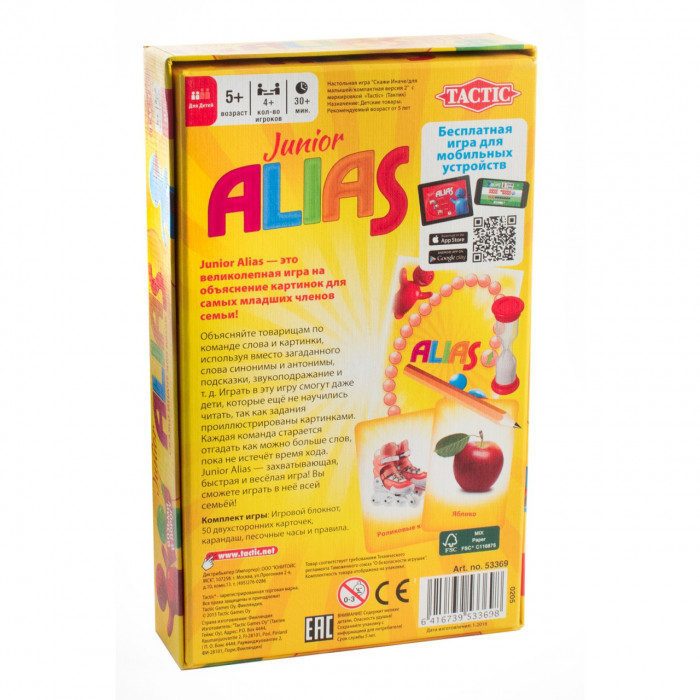 Junior Alias- захватывающая, быстрая и веселая игра! Вы сможете играть в нее всей семьей! Игра содержит знакомые детям слова и картинки.