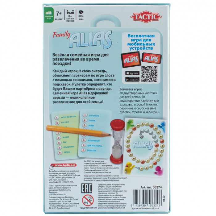 С двумя типами карточек, в Family Alias будет интересно играть как детям, так и взрослым. За каждое правильно угаданное слово оба партнера получают возможность двигаться вперед по игровому полю. Первый игрок, который достигнет площади победы - выиграл!