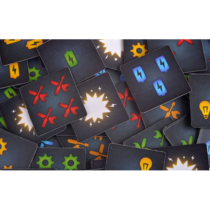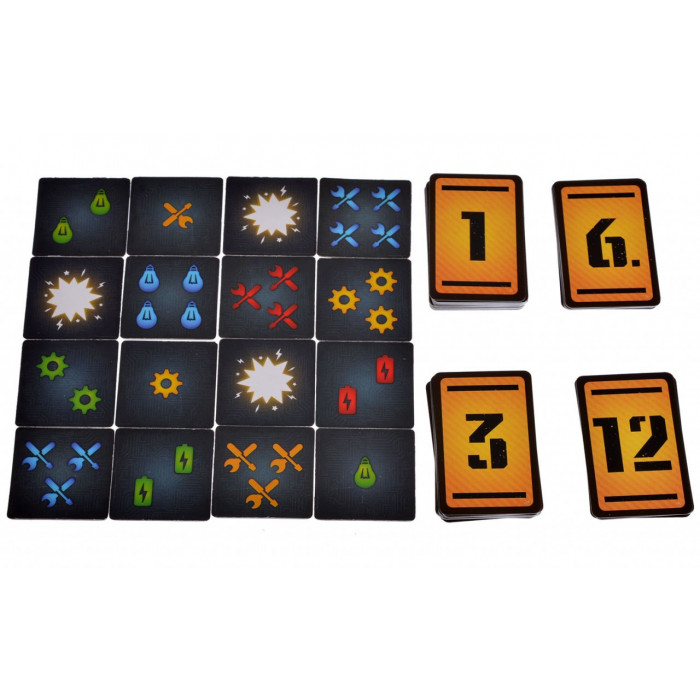 Перемешайте в колоду все жетоны "Памяти", возьмите оттуда 13 жетонов не глядя и добавьте 3 жетона "Короткого замыкания". Перемешайте полученную колоду из 16 жетонов. Разложите жетоны на столе лицом вверх квадратом 4×4. Разделите карточки для подсчета очков по видам и сложите их в отдельные колоды возле разложенного квадрата. Игрокам дается 1 минута для того, чтобы запомнить жетоны на столе, после чего жетоны переворачиваются рубашкой вверх. Выберите, кто будет активным игроком в первом раунде. Теперь вы можете начать играть, иногда заглядывая в правила.