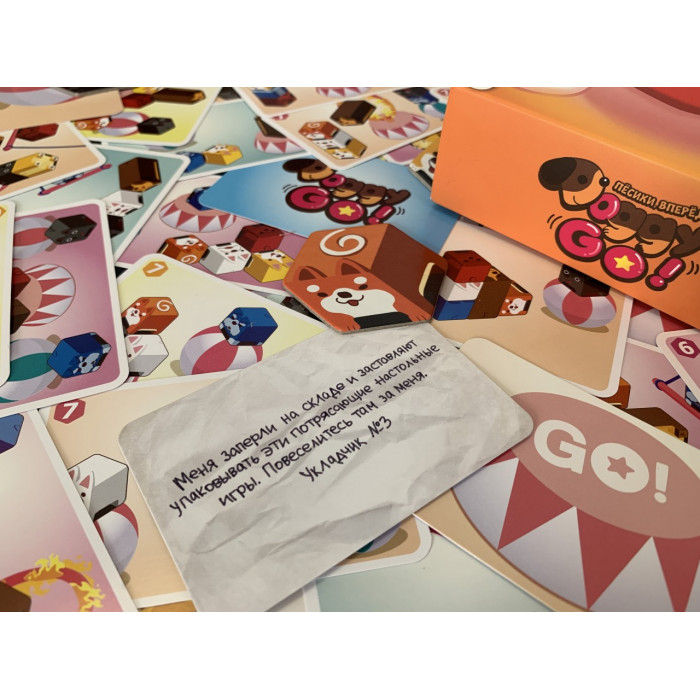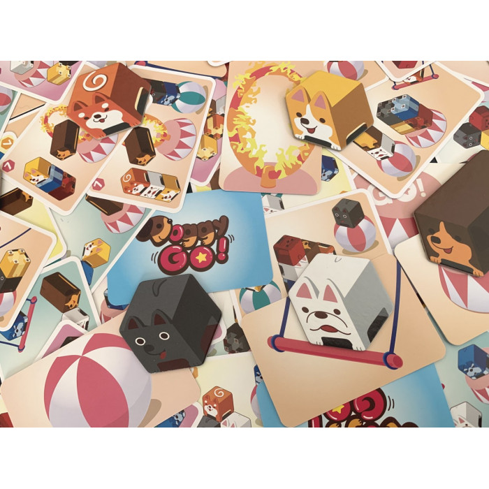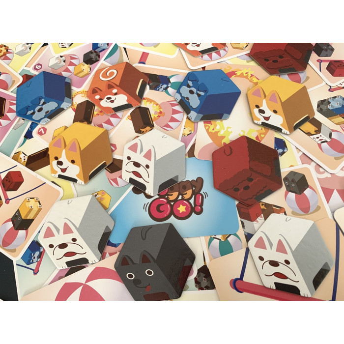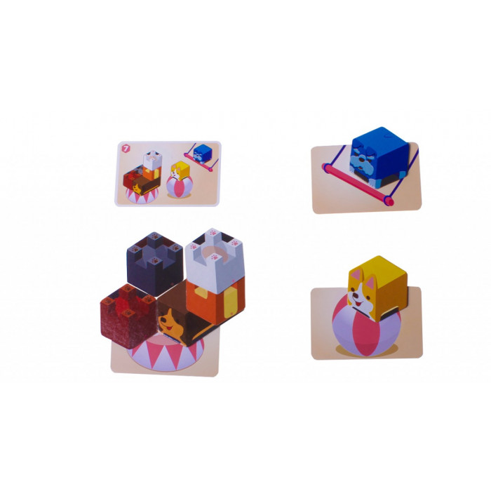 Игроки получают набор циркового реквизита и стопку хвостатых акробатов. Каждый раунд на стол выкладываются три карточки с заданиями, а вам нужно повторить одно из них. На одной карте песики выстроились в пирамиду, а такса прыгает через горящий обруч, на другой — бульдог и корги балансируют на надувных шарах, а в центре их собратья готовят трюк. Остается только правильно расположить подопечных и возгласом "Гав!" оповестить всех, что вы справились первым.