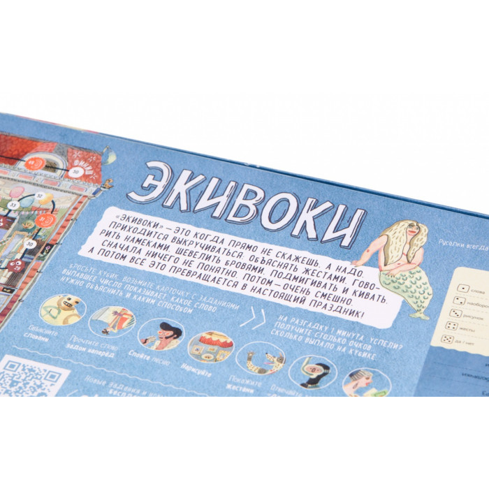 Игровое поле 240 карт Песочные часы Кубик 4 фишки-пингвина Пластилин 7 способов объяснения слов и 17 разновидностей экивоков Описание "Экивоки" — игра из карточек и кубика, которые заставят вас применить все умения, смекалку и фантазию.