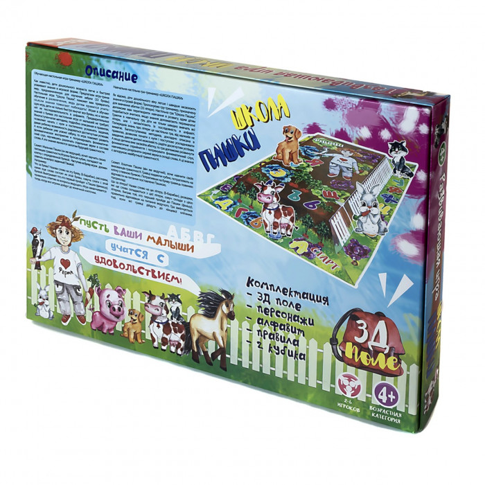 Веселый фермер Пашка познакомит детей с буквами и их фонетическим звучанием. Знание азбуки потребуются игрокам в процессе игры, в которой им помогут фишки в виде фигурок зверят живущих на ферме – жеребенка, щенка, котенка, поросенка, теленка и кролика.