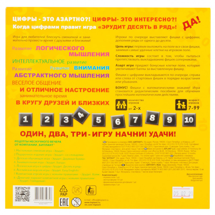 Настольная игра БИПЛАНТ 10019 Эрудит "Десять в ряд"