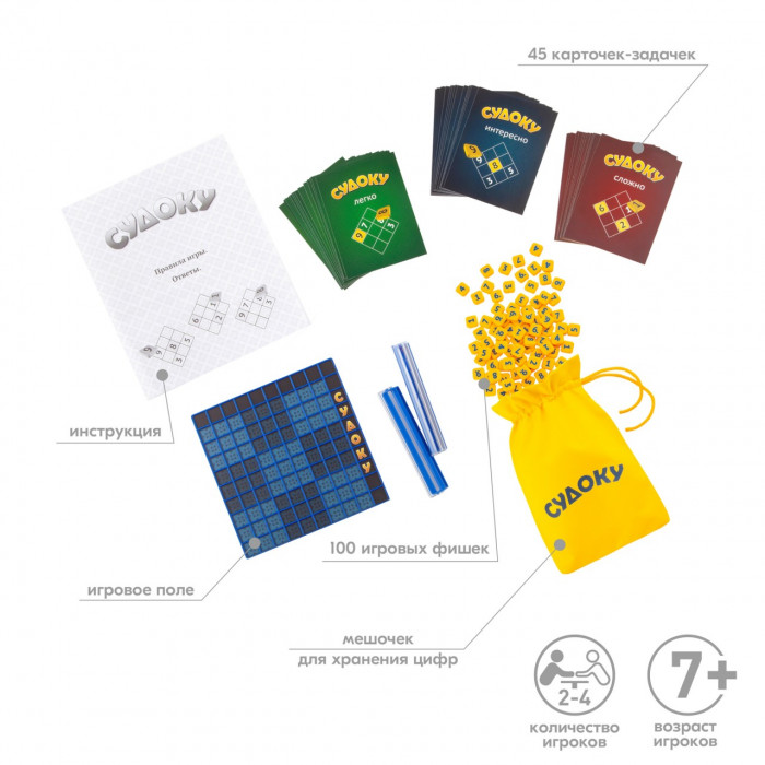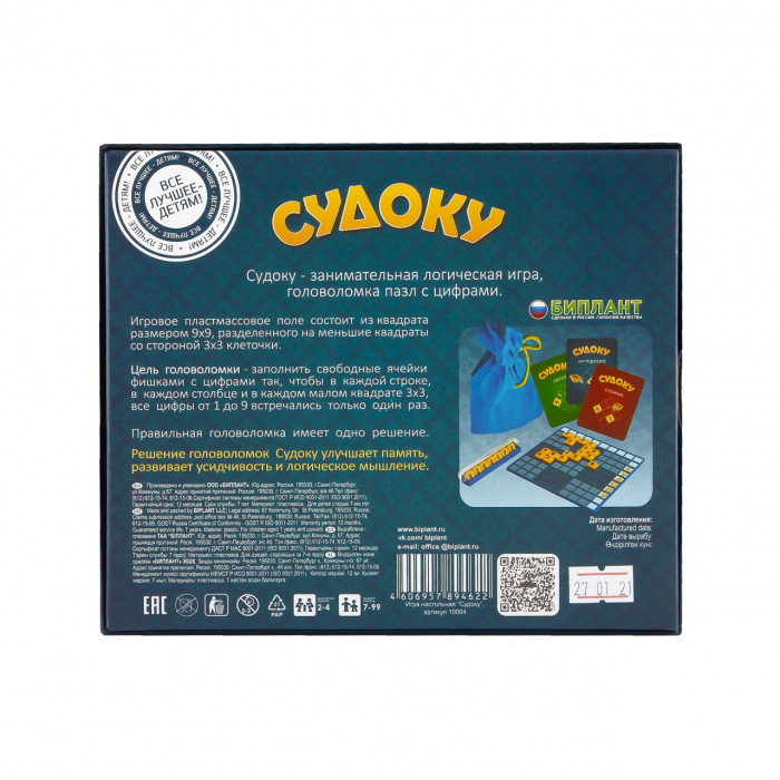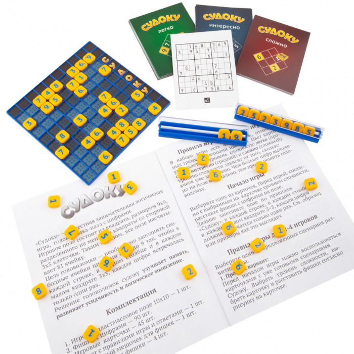 Игра предназначена для небольших компаний до четырех человек в возрасте от семи лет и старше. Игровое поле удобно размещается в крышке коробки - это гарантирует, что даже при неосторожном движении все цифры останутся на своих местах, и не придется начинать разгадывать головоломку с самого начала.