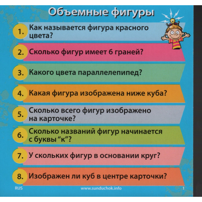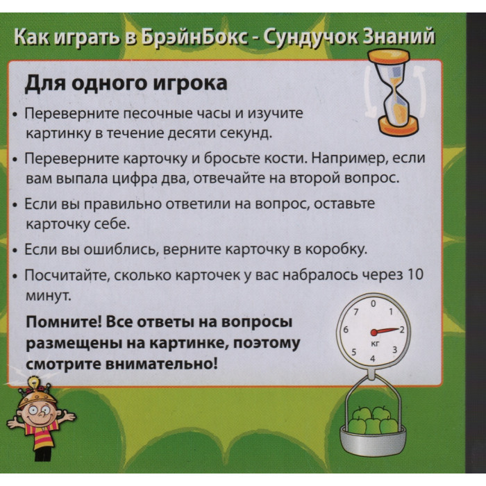 Правила игры: Если вы играете с друзьями, то первый ход отдается младшему из игроков. Данный игрок достает карточку из коробки, переворачивает песочные часы, и в течение 10 секунд старается запомнить все, что на ней нарисовано и написано. Затем он должен отдать карточку другому игроку и, бросив кости, ответить на тот вопрос, номер которого выпал на костях. Другой игрок проверяет правильность ответа, и если первый ответил верно, то карточку он оставляет себе, а если нет - возвращает обратно в коробку. Побеждает тот, кто в течение 10 минут соберет наибольшее количество карточек. Если вы играете один, то сами проверяете себя после каждого ответа. Можете ставить себе цели, например: " Мне надо собрать 20 карточек за 10 минут". К концу игры, вы подсчитываете количество карточек и проверяете, достигли ли поставленной цели.