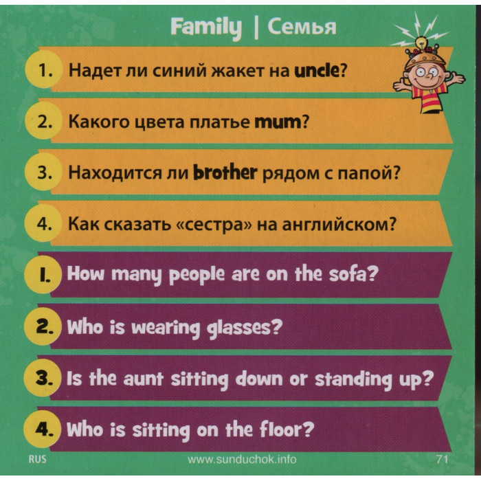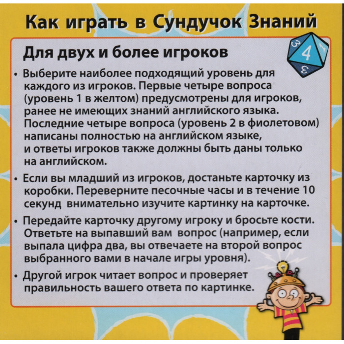 Внутри набора, вы найдете карточки с вопросами к картинкам на русском и английском языках. В игре доступно два уровня: для тех, у кого уже имеются небольшие знания языка и для тех, кто только начинает его изучение. Теперь не придется сидеть над учебниками и заставлять себя зубрить иностранные непонятные слова, ведь гораздо интереснее и проще выучить их в увлекательной игровой форме!