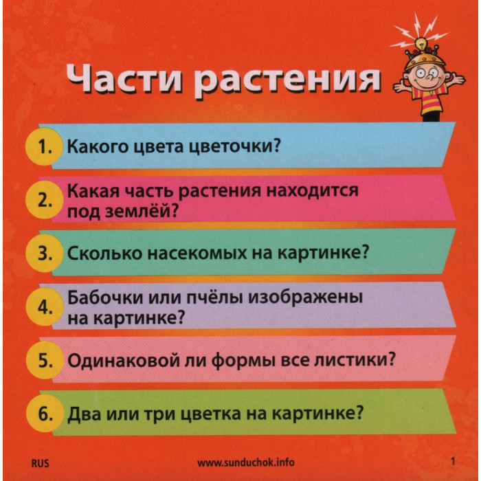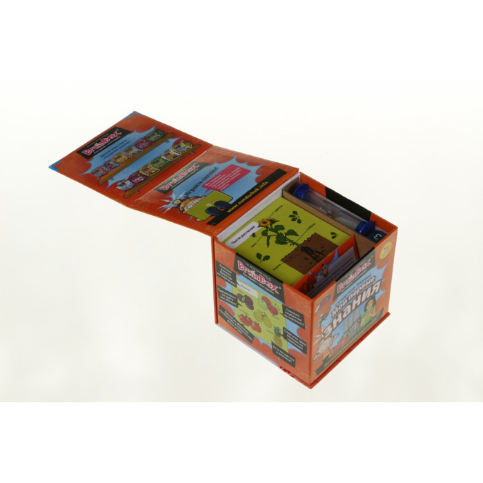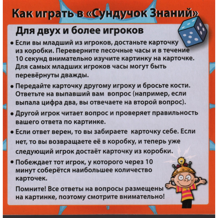 Перед вами новая замечательная игра серии, разработанная специалистами начальных классов. Она ориентирована на улучшение зрительной памяти малыша и закладывание у него первых знаний об окружающем мире. Kарточки включают в себя самые разные тематики: животные, растения, природные явления, материалы и движения. Игра станет хорошим спутником для детей, которые только недавно окунулись в мир знаний. Игра предназначена для детей от 3 лет. Игры от "Brainbox" - это не только развлечение, но и самое настоящее обучение. Они способствуют развитию таких важных качеств, как коротковременная и долговременная память, образное мышление и умение сопоставлять факты. А поскольку все вышеперечисленное представлено в виде увлекательной игры, малыш просто не сможет утомиться или заскучать в ее процессе. В игры данной серии будет интересно играть не только детям, но и взрослым. Поскольку в любом возрасте интересно проверить возможности своей памяти. А что сможете запомнить вы за 10 секунд? Вся продукция серии на 70% вторично перерабатывается и является экологически чистой. Правила игры: Если вы играете с друзьями, то первый ход отдается младшему из игроков. Данный игрок достает карточку из коробки, переворачивает песочные часы, и в течение 10 секунд старается запомнить все, что на ней нарисовано и написано. Затем он должен отдать карточку другому игроку и, бросив кости, ответить на тот вопрос, номер которого выпал на костях. Другой игрок проверяет правильность ответа, и если первый ответил верно, то карточку он оставляет себе, а если нет - возвращает обратно в коробку. Побеждает тот, кто в течение 10 минут соберет наибольшее количество карточек. Если вы играете один, то сами проверяете себя после каждого ответа. Можете ставить себе цели, например: " Мне надо собрать 20 карточек за 10 минут". К концу игры, вы подсчитываете количество карточек и проверяете, достигли ли поставленной цели. В комплекте: 55 карточек 1 карточка с инструкцией 1 песочные часы 1 игральные кости.