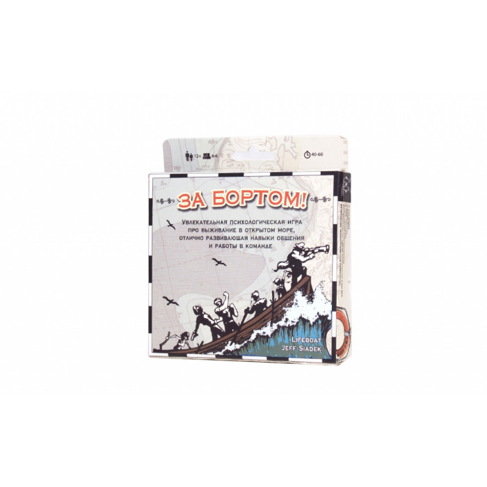 4-6 человек. Партия 60 минут. Как только вы увидите эту игру, вопрос во что поиграть с друзьями будет просто неактуален. Серьезно: "За бортом!" — это одна из самых классных компанейских игр. Это очень атмосферная, красивая и уютная игра, которая просто идеально подходит как для дружеских посиделок, так и для дороги или даже небольшой вечеринки. Локализация американского хита "Lifeboat" по одноименному фильму Альфреда Хичкока. Полная черного юмора и интриг игра, описывающая приключения 6 человек, спасшихся с затонувшего судна. В условиях ограниченных ресурсов игроки стараются доплыть до берега — и при этом получить как можно больше очков. Уже круто! За что дают очки? Очки даются за собственное выживание, смерть врага и выживание друга (карты врага и друга раздаются в случайном порядке в начале игры), а также накопленные ценности, например, деньги, картины или драгоценности, не имеющие практического применения в море. Хм. А как играть? Суть игры — в разделении припасов, взаимодействии на борту шлюпки, выборе курса и взаимопомощи для выживания. В случае игры как в абстракцию, становится достаточно простой технически. В случае игры в психологию, то есть с учетом сюжета, превращается в остросюжетный детектив с достаточно продолжительным временем партии и практическим отсутствием жертв на борту. То есть мы постоянно договариваемся и делим вещи? При опытном составе игроков "За бортом!" представляет собой взаимодействие двух альянсов на лодке: при этом в момент перевеса одного из них, как правило, происходит развенчание лидера и формирование новых групп. Кроме увлекательности сюжета и общего удовольствия от игры, это позволяет получить очень ценные навыки руководства в критических ситуациях. А как перевод? Общее оформление игры соответствует оригинальному, перевод выполнен не дословно, а с учетом переноса стереотипов и мемов в отечественные условия. Ок, для кого эта игра? Очень хороша для компаний, любящих и ценящих черный юмор. Отлично подходит для подготовки к переговорам и вообще улучшения коммуникативных навыков. Здорово развивает деловые качества. Может играться в кафе. Отлична для дороги. В комплекте 42 припаса, например, компас, вода, деньги, весла или крюк 6 карт персонажей и 6 карт банок (мест на лодке) 6 карт врагов и 6 карт друзей 24 карты навигации Маркеры усталости и ранений Правила на русском языке