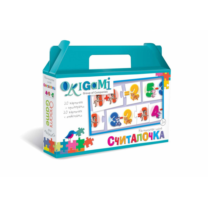 Обучающая игра Считалочка для малышей. В составе: 16 парных пазлов, один - с примером на сложение/вычитание в пределах пяти, второй - цифрой-ответом – "1+1" и "2", "5-2" и "3". Все элементы снабжены пазловым замочком, чтобы нельзя было их совместить неправильно.