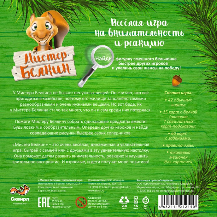 "Мистер Белкин" — это очень веселая, динамичная и увлекательная игра. Сыграй с семьей или с друзьями в эту удивительную настолку. Она поможет детям развить внимательность, реакцию и улучшить зрительное восприятие. И взрослые, и дети получат море позитива!