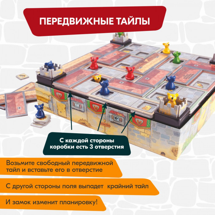 Перед началом игры вам предстоит собрать замок-конструктор. Благодаря многоуровневому игровому полю, вы получите замысловатый лабиринт.