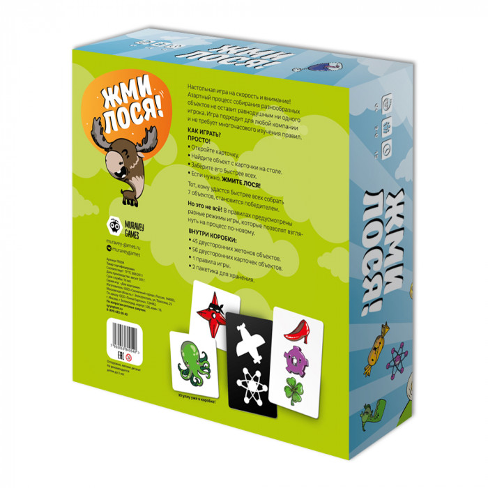 Веселая настольная игра на скорость и внимание! "Жми лося!" развивает восприятие цвета и формы, наблюдательность и реакцию. Простой, но в то же время азартный процесс собирания разнообразных объектов не оставит равнодушным ни одного игрока. Игра подходит для любой компании и не требует многочасового изучения правил.