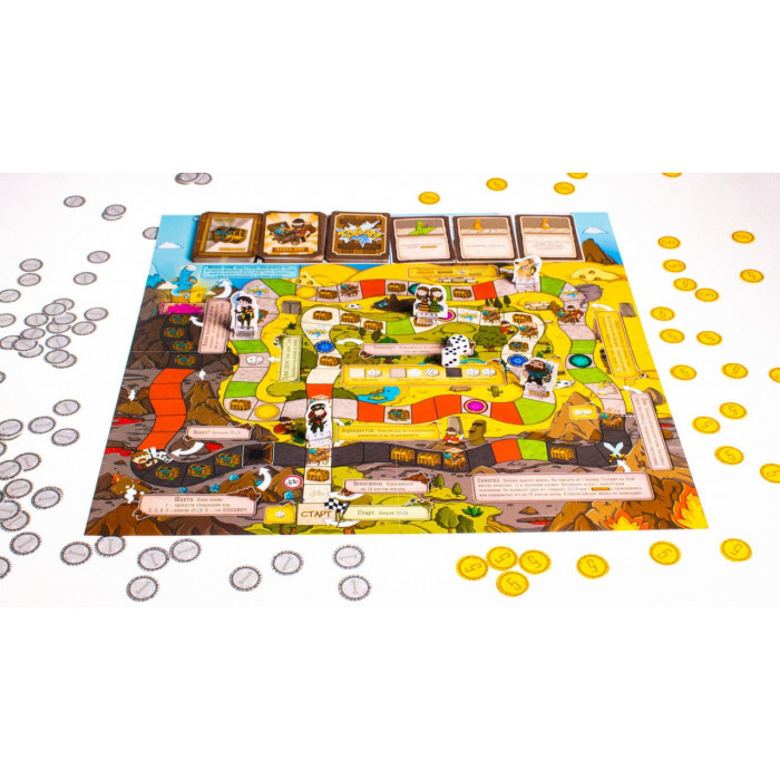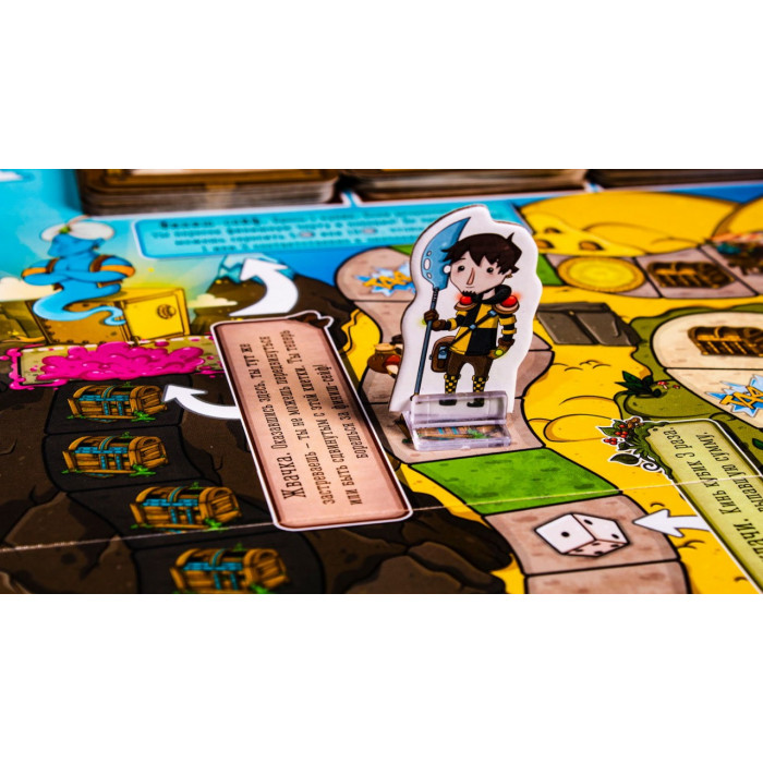 Ваша задача — добраться до финиша и заполучить сокровища злобного джинна, выкинув на кубиках 6. По дороге придется полагаться на собственную удачу, подставлять соперников, воровать монеты — одним словом, быть настоящим искателем приключений.