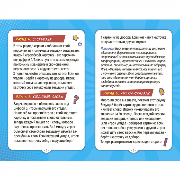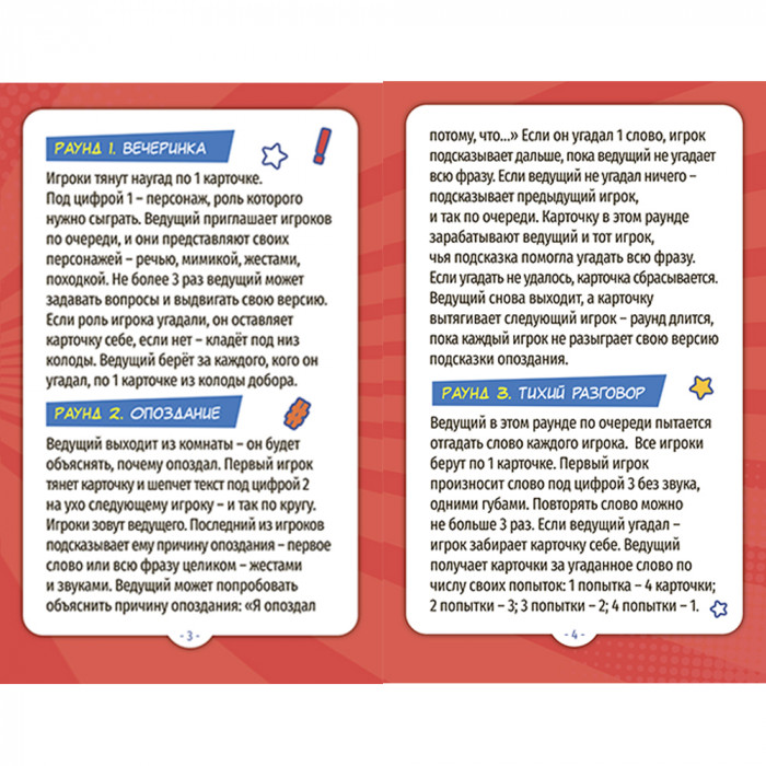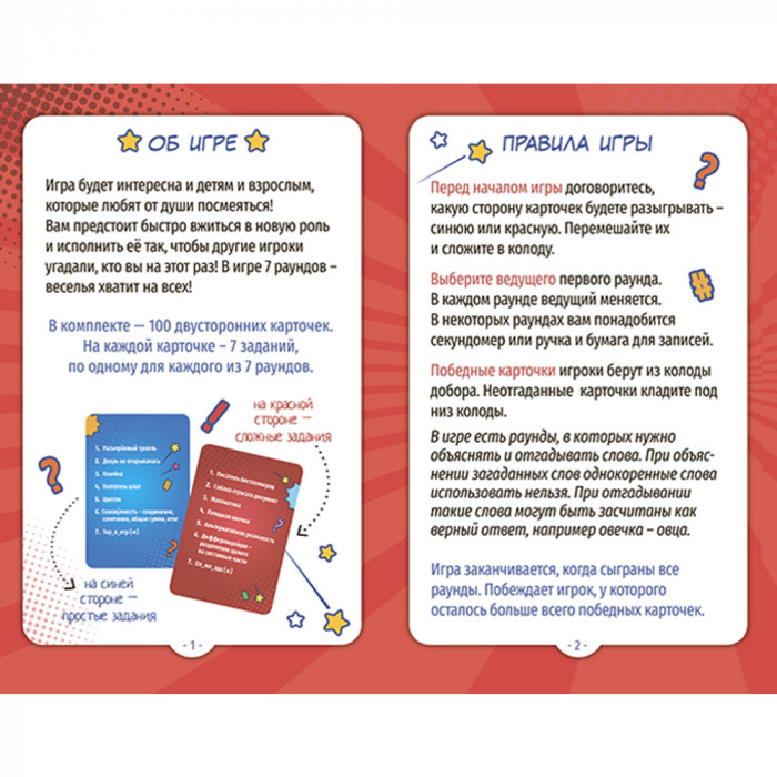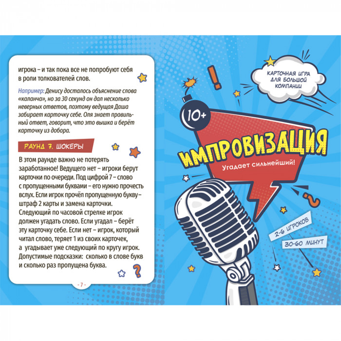 Механика игры построена на заданиях, разделенных на 7 раундов! Каждый игрок откроет в себе актерский талант и станет мастером импровизации! "Объяснить слова без слов", "угадать смысл неизвестных понятий", "читать по губам" - только часть увлекательных заданий в борьбе за звание Великого импровизатора!