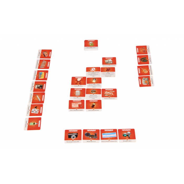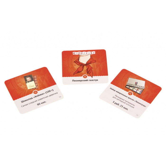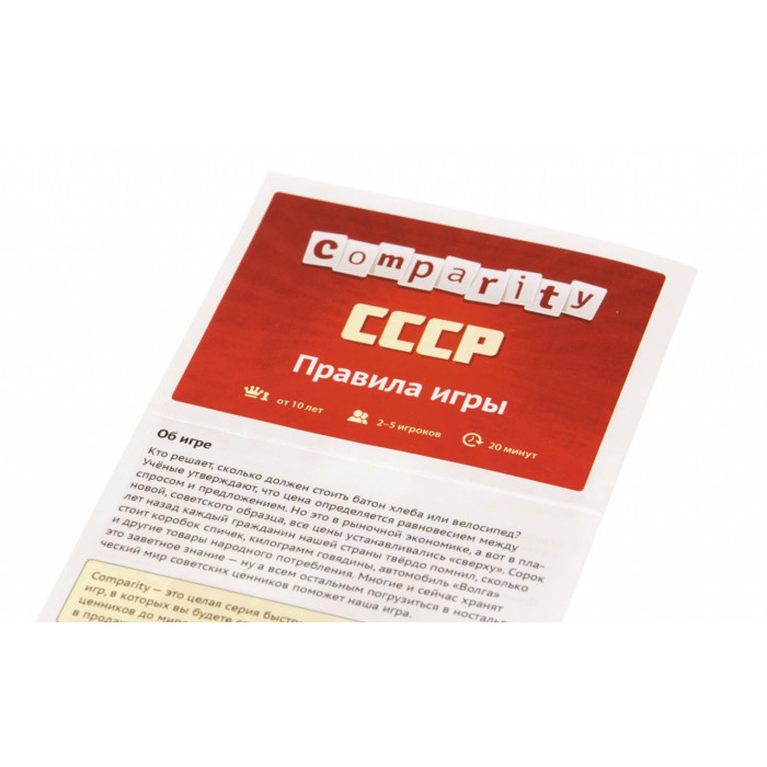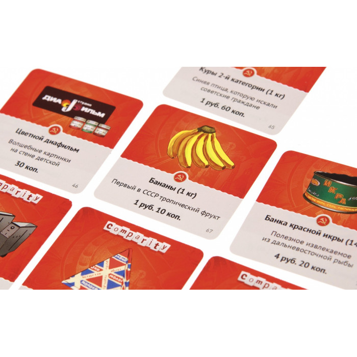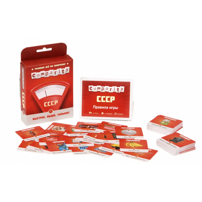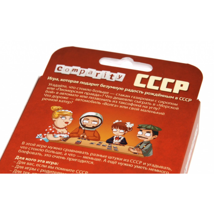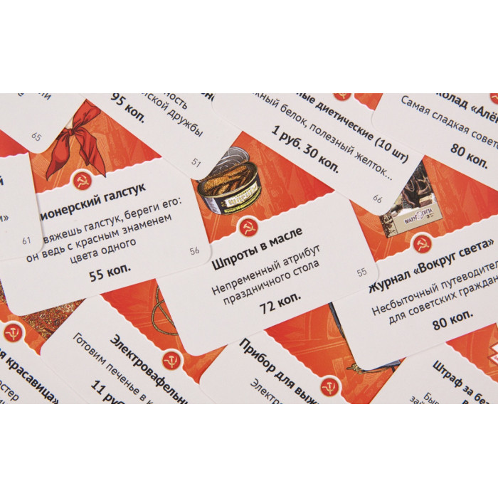 2-5 человек Партия 20 минут На дворе 1981-й год. В магазинах стоят детские велосипеды "Школьник", на улицах — телефонные автоматы; кроме советского автопрома сложно встретить что-то еще. У вас есть большая стопка разных знаковых советских вещей. Угадайте, что стоило больше — стакан газировки с сиропом или "Пионерская правда"? Что дешевле: сыграть в "Морской бой" в автомате или позвонить из таксофона на углу? Что дороже — автомобиль "Волга" или свой маленький речной катер? В этой игре нужно сравнивать, угадывать и немного блефовать, это очень пригодится. Для кого эта игра? Для вас,если вы помните СССР. Для игры с родителями. Поверьте, они будут очень рады. Для тех, кто любит компанейские игры на блеф. В дорогу. В подарок патриоту. В комплекте 100 карточек Правила