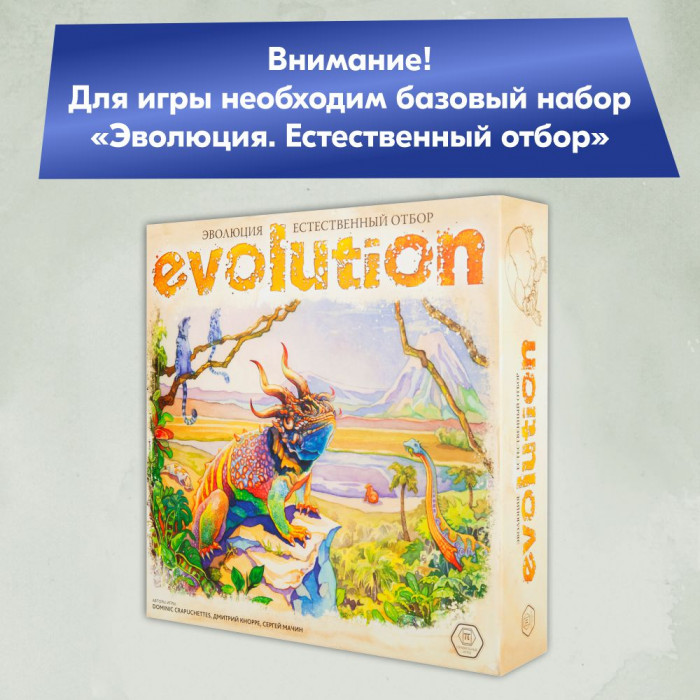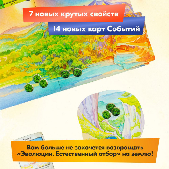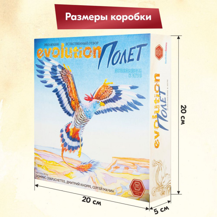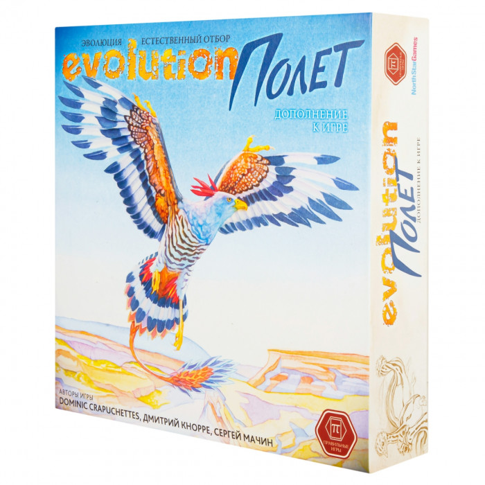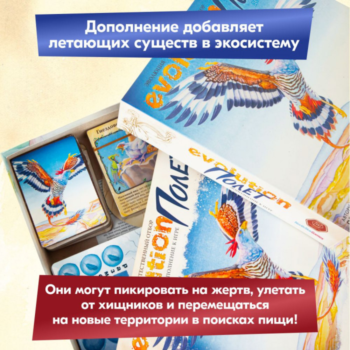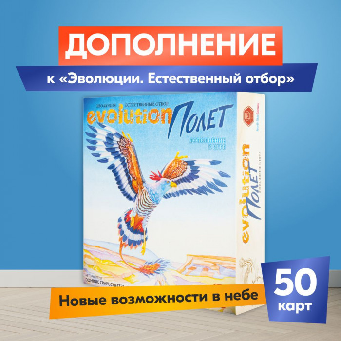 "Полет" — дополнение к настольной игре "Эволюция. Естественный отбор" (Evolution), добавляющее летающих существ в экосистему. Созданные вами виды смогут пикировать на ничего не подозревающую жертву, улетать от хищников и перемещаться на новые территории при истощении запасов пищи!