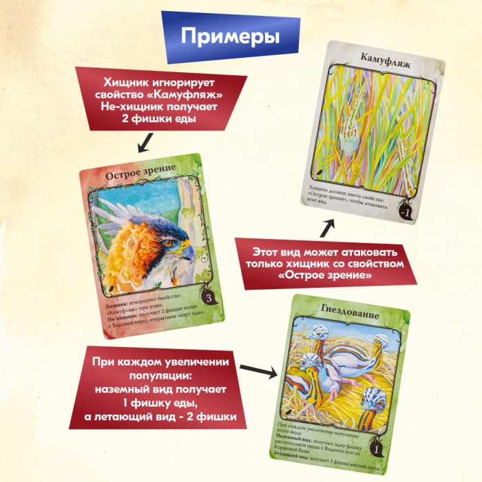 Для создания летающего вида вам нужно сбросить две карты с руки (вместо одной). Взамен вы получаете планшет летающего вида и карту "Полет", которая становится первым из его трех свойств. Летающие виды могут потреблять пищу не только с Водопоя, но и с Утеса. Им не страшны наземные хищники, и в то же время сами они, став хищниками, могут атаковать любые виды "с высоты". Летающие виды извлекают пользу из новых свойств — "Гнездовой паразит" и "Гнездование", а также из новых карт Событий. Однако летающему виду требуется дополнительное питание для обеспечения крыльев энергией. Прежде чем добывать прокорм для обеспечения популяции, нужно набрать еду сообразно размеру тела. Таким образом, говоря упрощенно, летающему виду требуется почти в два раза больше пищи, чем наземному.