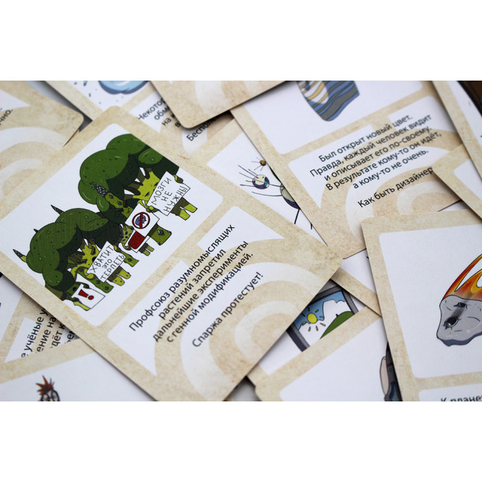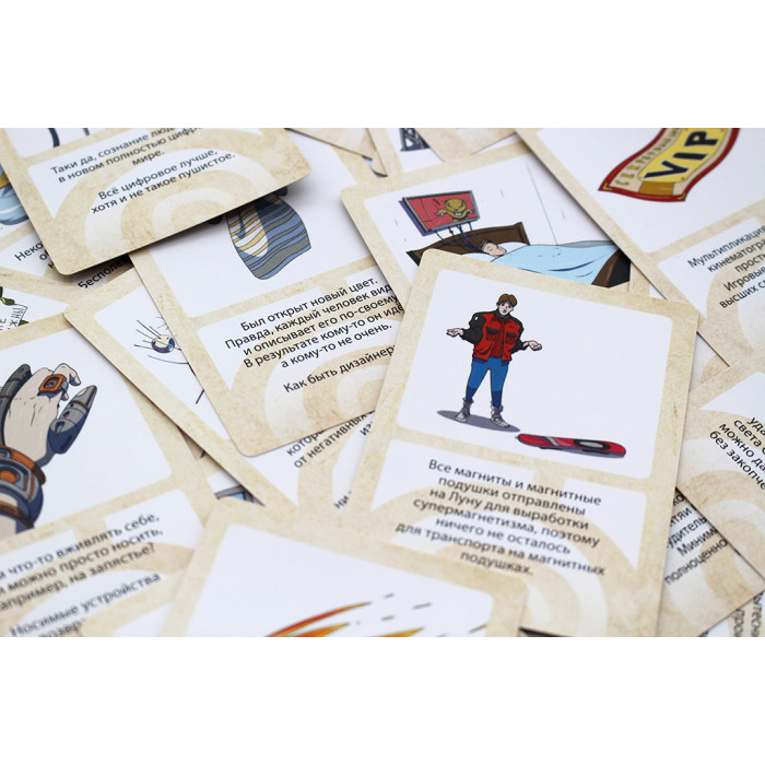Доставайте карты из колоды. Изобретайте, как будет выглядеть объект или явление на карте в будущем. После вашего ответа вам могут бросить вызов и рассказать свою версию. После рассказов все голосуют за наиболее понравившуюся историю, а рассказчики получают очки за отданные им голоса. Победит тот игрок, у которого после окончания игры будет больше всего очков.