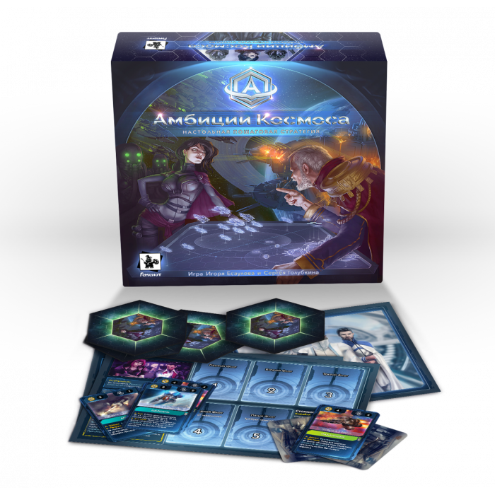 "Амбиции Космоса" - настольная стратегическая игра для компании от 2 до 4 человек, включающая в себя вариативное тактическое поле, карты кораблей и улучшений, счётчик ресурсов и кубики.