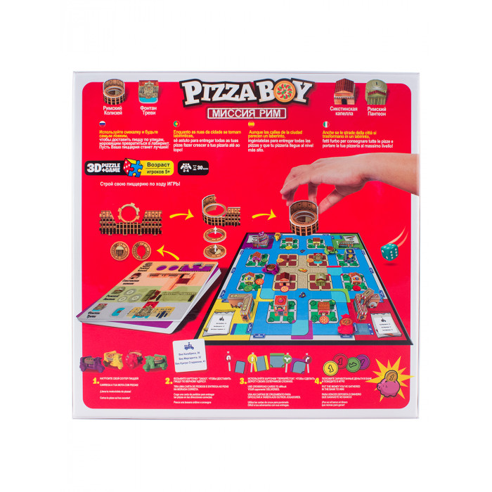 - 7 наборов для игры (16 частей 3D-зданий, 4 пиццерии, 12 фишек пиццы, 12 денежных фишек)