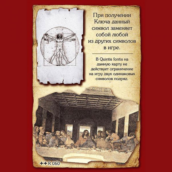 Quintis Fontis — это наиболее сложный вариант "Загадки Леонардо", который предназначен для опытных игроков. С одной стороны, он требует от участников внимательно следить за большим количеством карт и чужими действиями, а с другой — открывает перед игроками дополнительные возможности для создания победных комбинаций. На общем поле практически невозможно победить в одиночку: в Quintis Fontis необходимо учитывать интересы соперников и умело использовать их к собственной выгоде.