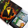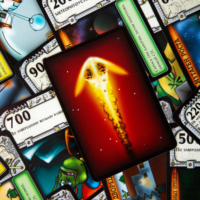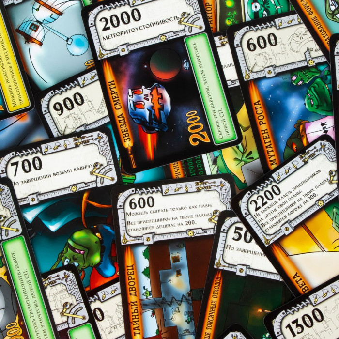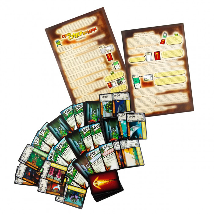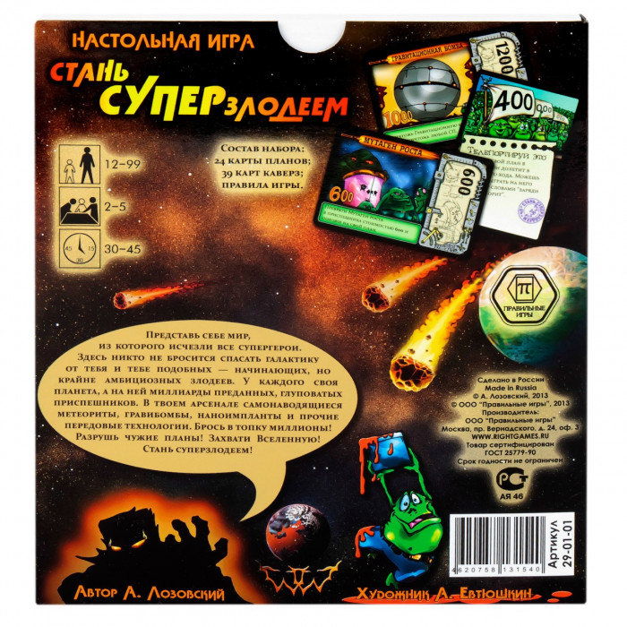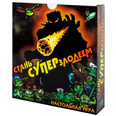 Чем отличается супергерой от суперзлодея? Один творит добро, другой — зло? Ну, это зависит от того, с какой стороны посмотреть. Настоящее отличие — в том, что супергероев множество, а настоящий суперзлодей может быть только один. Поэтому стать суперзлодеем куда более почётно — но и гораздо сложнее. К счастью, мы знаем, что для этого нужно: небольшая планета, населённая глуповатыми, но беззаветно преданными приспешниками, детальные планы покорения вселенной и метеориты, чтобы швыряться в соперников. А как именно всем этим распорядиться — злодейская натура подскажет. "Стань суперзлодеем" — это юмористическая карточная игра, участники которой воплощают в жизнь злодейские планы и подстраивают друг другу каверзы. Цель каждого из игроков — первым реализовать секретные проекты на общую сумму 5000 очков. Для этого участники прибегают к помощи верных приспешников, разыгрывают полезные для себя и вредные для соперников карты, а также запускают друг в друга разрушительные метеориты. Тот, кому первым удастся достигнуть цели игры, объявляется всегалактическим суперзлодеем и безусловным победителем. В игре "Стань суперзлодеем" используются карты двух видов: планы (на обороте которых изображён метеорит) и каверзы (с приспешниками на рубашке). Планы — это коварные задумки, которые приближают злодеев к захвату мира и победе в игре, например "Гравитационная бомба" или "Ускоритель времени". У каждого плана есть стоимость строительства и победные очки: чаще всего эти параметры совпадают, но могут и отличаться. Карта каверзы состоит из двух частей. В верхней половине указано число от 100 до 700 — это количество приспешников, которыми карта позволяет воспользоваться. В нижней части — текстовое описание какого-либо злодейского приёма: "Стройка века", "Инопланетное похищение", "Пятилетка за один ход" и т. п. Каждую такую карту можно разыграть одним из двух способов: либо как приспешников, либо как каверзу. В свой ход игрок тянет по одной карте из каждой колоды. Каверзу он забирает на руку, а план должен сразу же выложить на стол: либо лицом, либо рубашкой вверх. В первом случае карта считается очередным планом игрока, а во втором — метеоритом, летящим в сторону одного из соперников (стрелка на карте должна указывать на жертву метеорита). Затем игрок может сыграть с руки до двух карт — одну каверзу и одних приспешников. Каверзы действуют согласно своему тексту: например, разрешают взять или сыграть дополнительные карты, усиливают свои или сбивают чужие метеориты. Приспешники выкладываются на планы игрока, приближая их к воплощению в жизнь: как только суммарное число приспешников на плане станет не меньше его стоимости, он превратится в реализованный секретный проект. А это не только победные очки, но и почти всегда полезные свойства: "Звезда смерти", к примеру, даёт возможность уничтожать вражеские проекты. Помешать планам соперника можно и с помощью каверз, но самый простой и надёжный способ сделать это — метеориты. Когда ваш метеорит обрушивается на планету соперника, вы можете сбросить карту приспешника с любого его незавершённого плана. Некоторые каверзы заряжают метеорит, и тогда он уничтожает не приспешников, а уже готовый секретный проект. Однако некоторые каверзы позволяют сбивать метеориты или даже разворачивать их в другую сторону. Кроме то