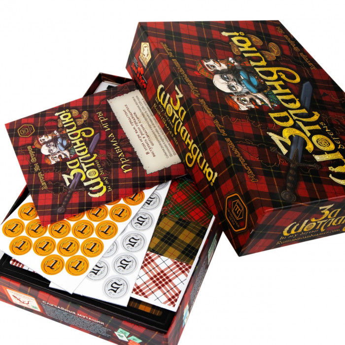 В конце 13 века английский король Эдуард I воспользовался династическим кризисом в Шотландии, чтобы распространить свою власть на северного соседа. За считаные месяцы войска Эдуарда оккупировали страну, а местная знать принесла ему присягу, однако мелкие феодалы подняли всенародное восстание. В конечном счёте северянам удалось отстоять свою независимость — после двух кровопролитных войн, растянувшихся на пятьдесят с лишним лет. Но цена свободы могла оказаться не столь высокой, если бы не соперничество шотландских аристократов, которые в поисках личной выгоды порой даже выступали заодно с англичанами. "За Шотландию!" — настольная игра, участники которой возглавляют шотландские кланы перед лицом английского вторжения. Игроков объединяет общая цель — остановить Эдуарда, — ради достижения которой они собирают войска и отправляют их на поле боя. Однако в конце партии, когда война закончится, новым королём скоттов и победителем в игре станет только один из соперников — самый богатый, а вовсе не самый доблестный. Поэтому игроки стараются вести освободительную войну экономно и даже ухитряются на ней зарабатывать, в том числе перебегая на сторону противника — ведь деньги, как известно, не пахнут. В начале игры участники выбирают кланы, за которые будет выступать: Бьюкененов, Дональдов, Коминов, Макеев или Маклаудов. Каждый игрок получает 4 золотых и 4 отряда, а также компоненты своего клана: планшет для хранения личных войск и денег, поле, куда будет выкладывать отправленные в бой отряды, и два жетона выбора — с английской короной и шотландским беретом. Посередине стола располагается общее игровое поле с Путём поражений, на котором отмечают продвижение войск Эдварда. Кроме того, на поле выкладывается колода из семи карт английских войск, карты кинжалов и волынок. Кинжалы выдаются игрокам за предательства. На каждой такой карте изображено до трёх клинков, и чем больше их наберётся у клана к концу партии, тем ниже его шансы на победу. А волынки — это карты особых действий, которыми можно воспользоваться в разные моменты игры. В начале раунда открывается верхняя карта английских войск. На ней указано, с чем предстоит столкнуться шотландцам на этот раз: сила англичан, награда для участников битвы и особые правила, действующие на протяжении этого раунда. Затем соперники совершают действия. В свою очередь игрок должен пополнить ряды одним из четырёх способов: взять себе 1 золотой либо 2 отряда, купить 4 отряда за 1 золото, или же выложить по 1 отряду на поле каждого клана, а также на общее поле Шотландии. Кроме пополнения, игрок может (но не обязан) отправить в поход сколько угодно своих отрядов, переложив их с планшета на клановое поле. Когда все действия выполнены, каждый участник решает, кого он будет поддерживать в этом раунде: шотландцев или англичан. Суммарная сила верных Северу отрядов сравнивается с силой английских войск, к которой прибавляются отряды перебежчиков, а затем все участники сражения получают награду. Вознаграждение сторонникам Шотландии зависит от того, победили они англичан или проиграли. В первом случае верные кланы берут по карте волынок, во втором — по одному отряду. Кроме того, на карте английских войск указано, сколько золота получают шотландцы при победе и поражении. Перебежчики получают карты кинжалов и заб