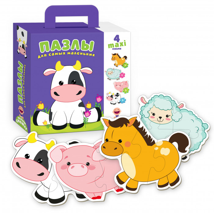 Складывай животных – познавай окружающий мир! "Пазлы для самых маленьких" - познакомят малыша с дикими и домашними животными, а также помогут развить речь, мышление и мелкую моторику. Особенности: крупные детали, толстый не гнущийся картон (2 мм). Комплектация: 4 макси пазла (12 пазловых деталей).
