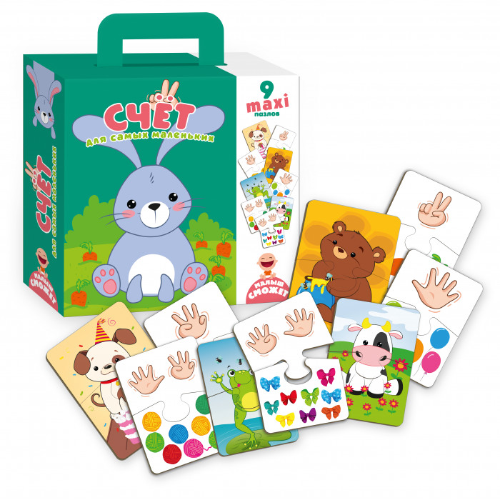 Учись считать с забавными зверушками! "Счет для самых маленьких" - интересная и познавательная игра, которая поможет малышу с легкостью научиться считать, развить память, внимание, мышление, речь и мелкую моторику. Особенности: крупные детали, толстый не гнущийся картон (2 мм). Комплектация: 9 двойных двусторонних пазлов.