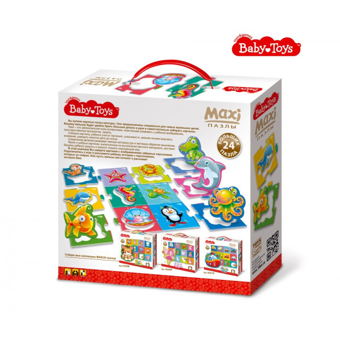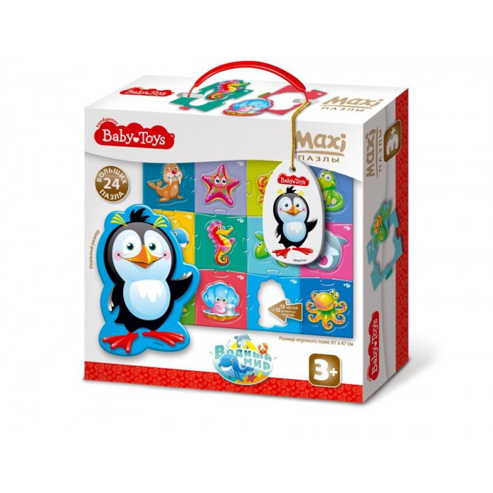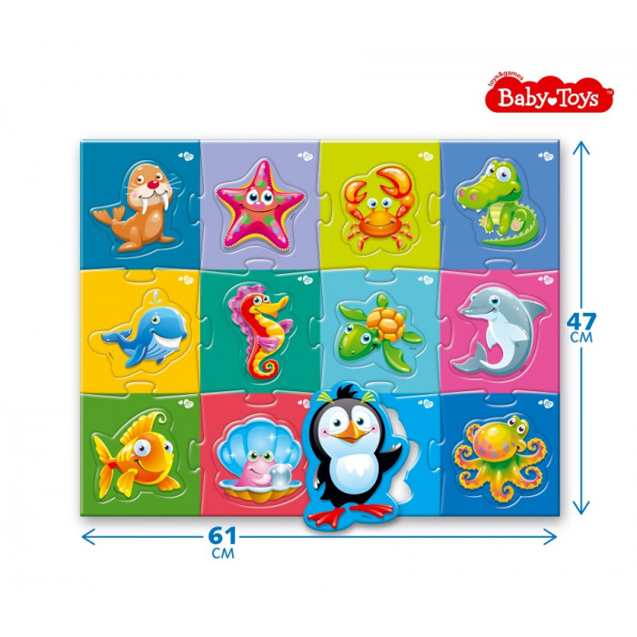 В комплекте 24 больших картонных пазла со вставками в виде разных симпатичных обитателей водного мира.