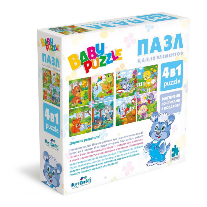 Постепенно усложняя сборку пазла от 4 элементов до 12 элементов, ребенок научится внимательности, концентрации, а также сможет развить мелкую моторику.