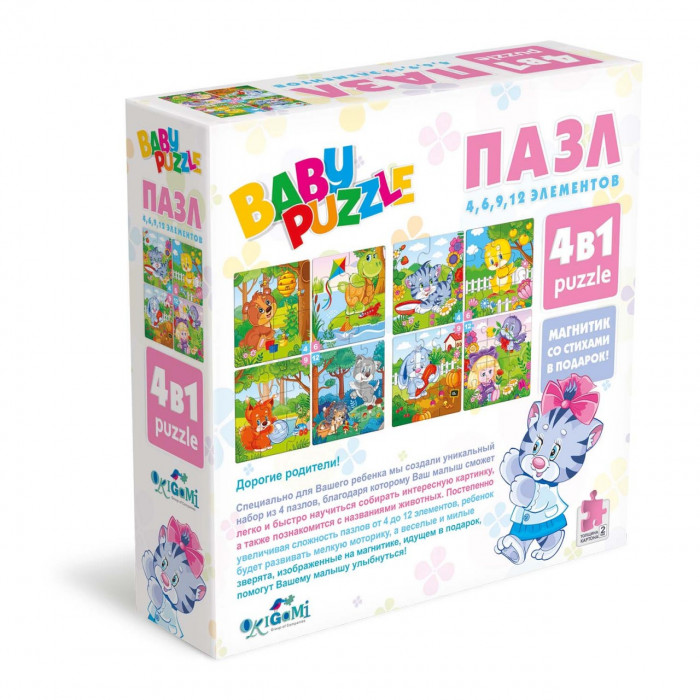 Постепенно усложняя сборку пазла от 4 элементов до 12 элементов, ребенок научится внимательности, концентрации, а также сможет развить мелкую моторику.